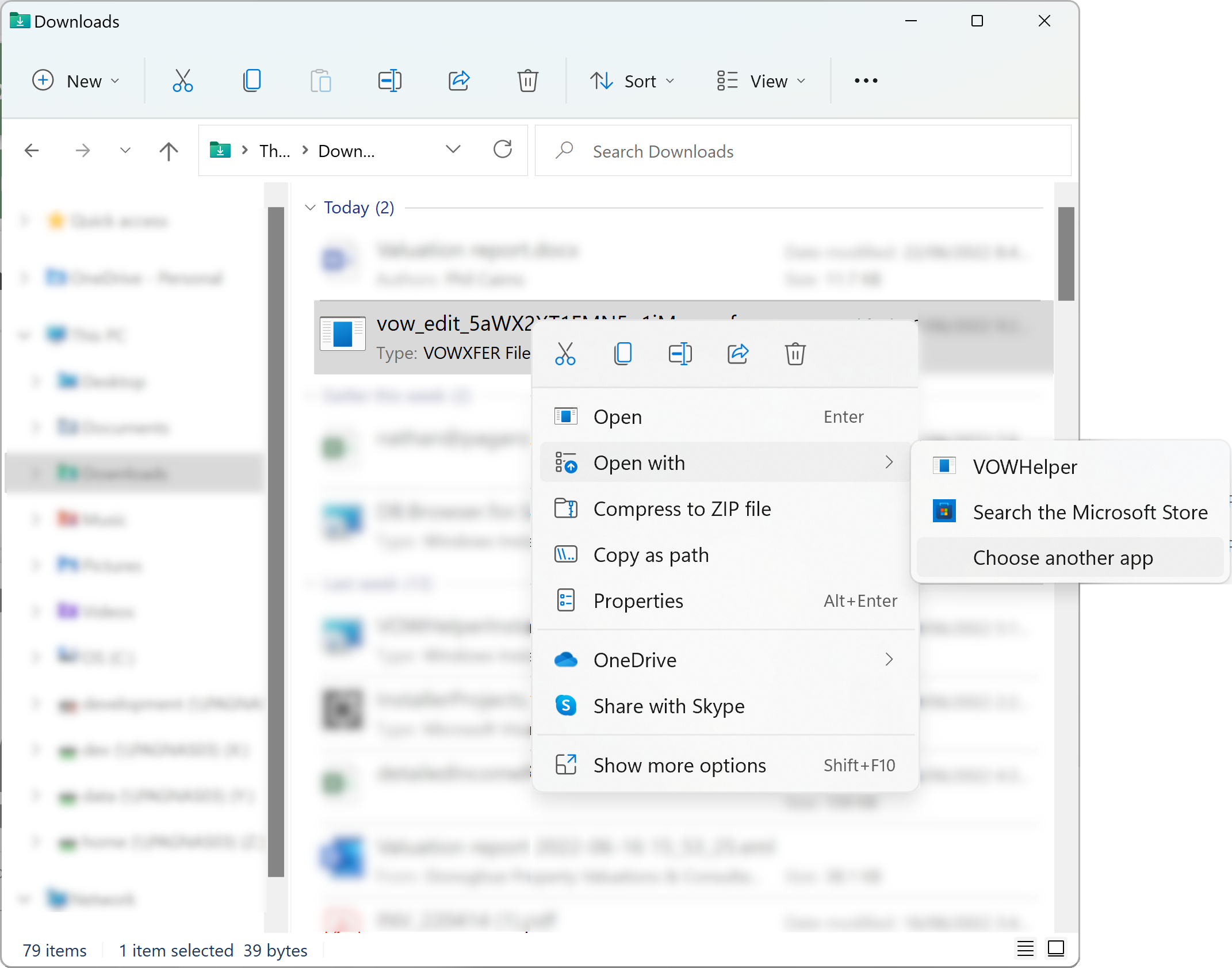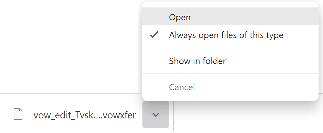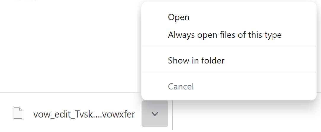 First, click the and then choose not to open the helper. Then open your Downloads folder. Right-click the downloaded file (it'll be named something like vow_edit_01234567890123456.vowxfer, where the 16 digits could be any letters or numbers) and choose Open with | Choose another app.
