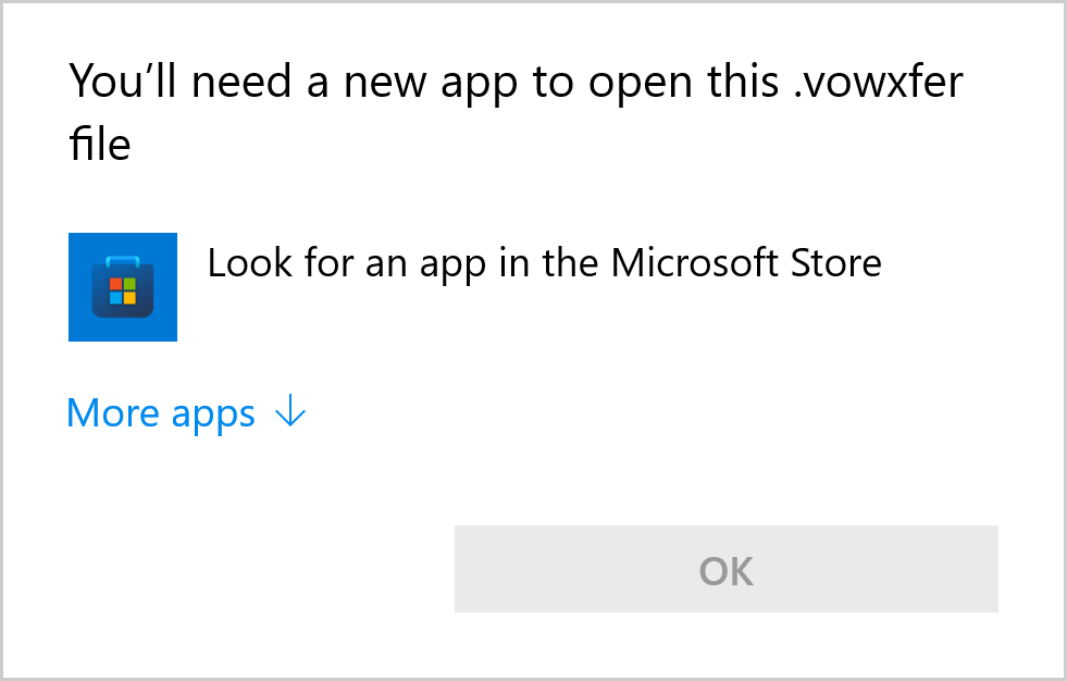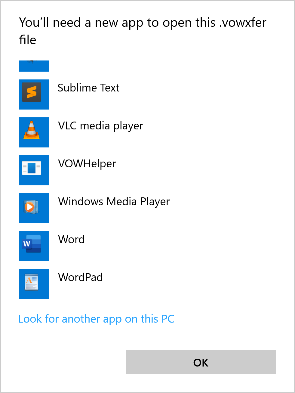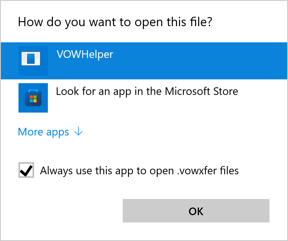 In the popup, tick the Always use this app to open .vowxfer files and then click the VOWHelper item followed by OK (or double-click the VOWHelper item after ticking the box).