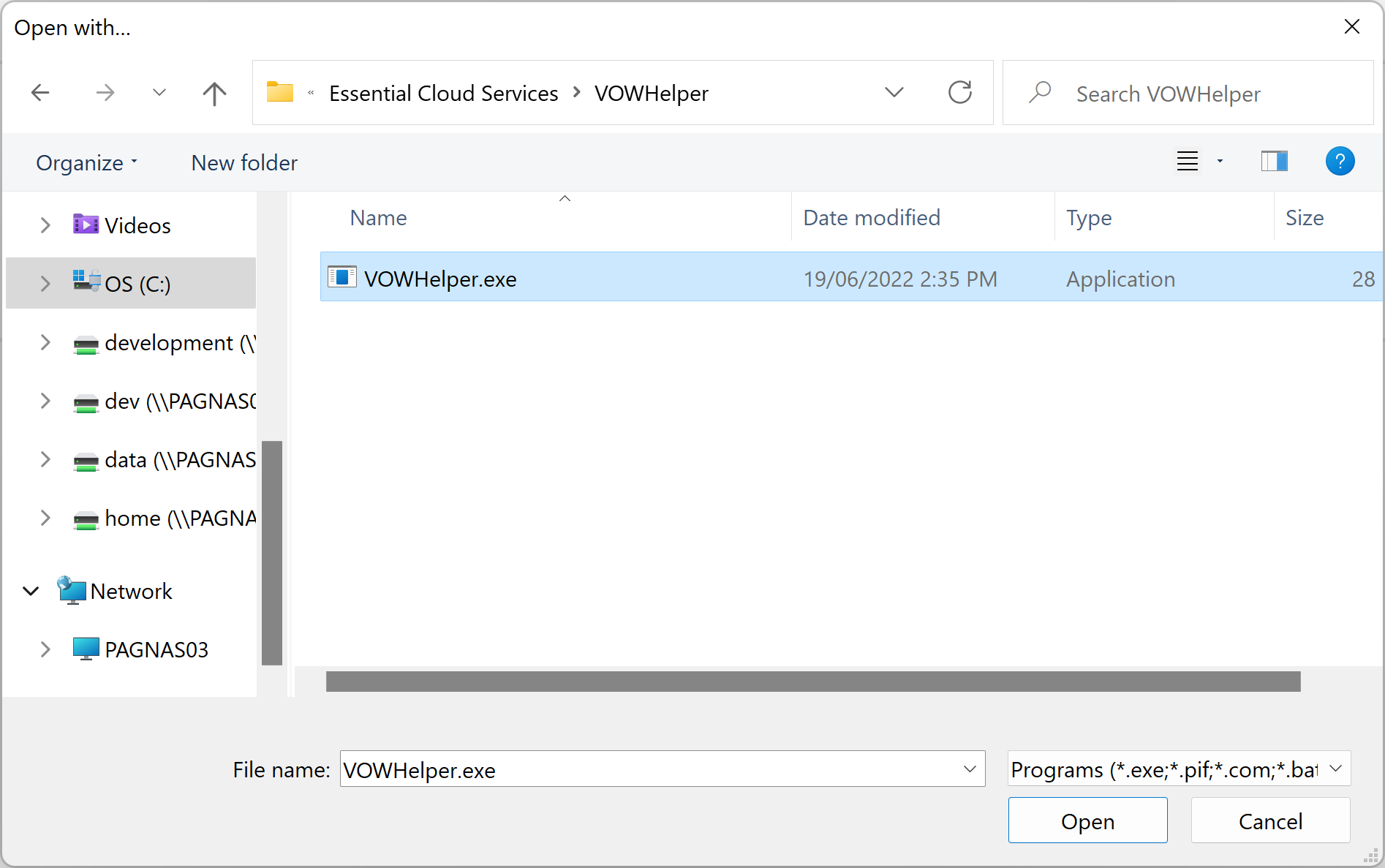 Windows will open a window that will let you browse for the helper application. You should go to C:\Program Files (x86)\Essential Cloud Services\VOWHelper and double-click VOWHelper.exe.